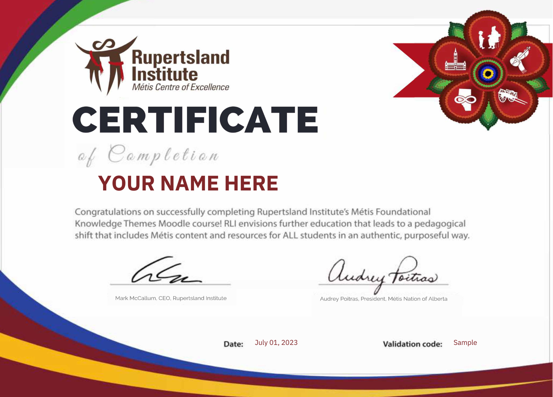 After you finish the course, you will receive the RLI's Métis Foundational Knowledge Themes Moodle Course Certificate of Completion: